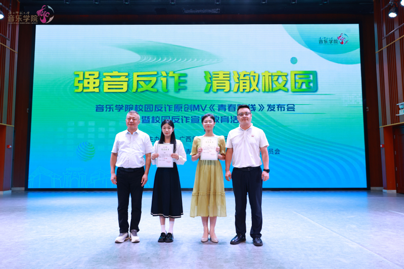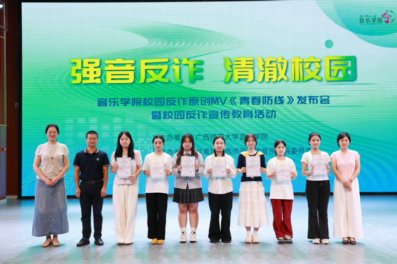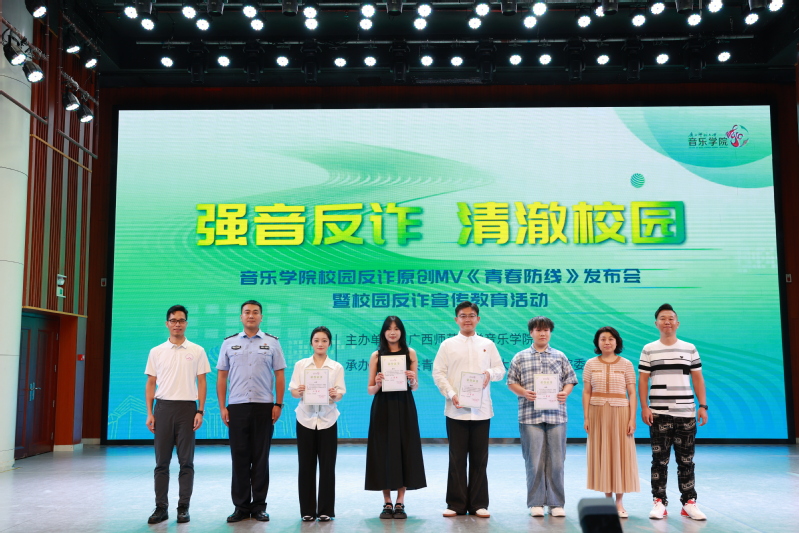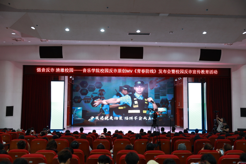 为深入贯彻落实全民反诈工作要求,切实强化广大师生防范电信网络诈骗的意识和能力,营造安全、稳定、和谐的校园环境,9月29日晚,音乐学院在雁山校区音乐楼B307综合厅隆重举行“强音反诈 清澈校园”——校园反诈原创MV《青春防线》发布会暨反诈宣传教育活动。人民网广西频道相关负责人张克庆、桂林市公安局雁山分局刑侦三大队负责人李灵希及校学工部(处)、研工部、校团委、保卫处、音乐学院等相关单位负责人出席活动,音乐学院500余名师生代表共同参与。