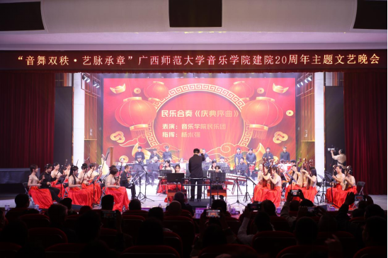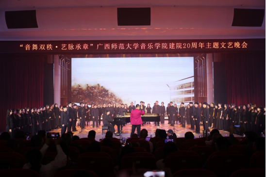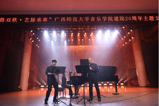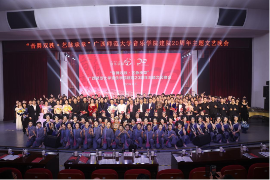 11月15日晚,广西师范大学音乐学院建院20周年主题文艺晚会于雁山校区音乐楼三楼综合厅隆重举行。学校党委副书记莫坷,学校原副校长苏桂发,音乐学院党政领导班子成员,校内外各职能部门、兄弟院校代表,历届院友和学院师生代表近600人共同观看演出。