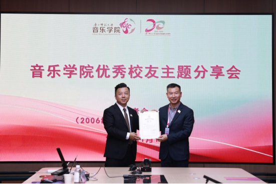 分享会上,学院行政主要负责人为陈孝余教授颁发客座教授聘书,诚挚欢迎他常回母校交流指导,共同推动音乐学科建设与人才培养工作高质量发展。