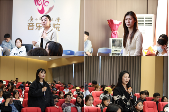 在互动交流环节,在场学生结合自身实际,从学术研究方法、艺术创业实践、教师职业规划等多个角度踊跃提问,三位校友分别结合各自领域的专业经验给予了细致解答。现场气氛热烈,思维碰撞不断。