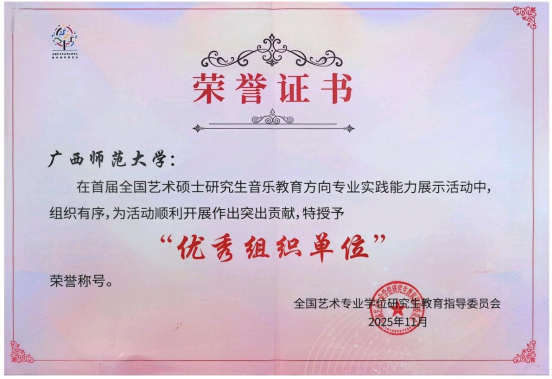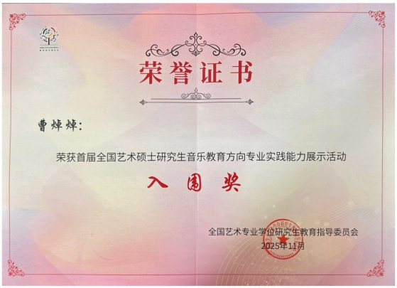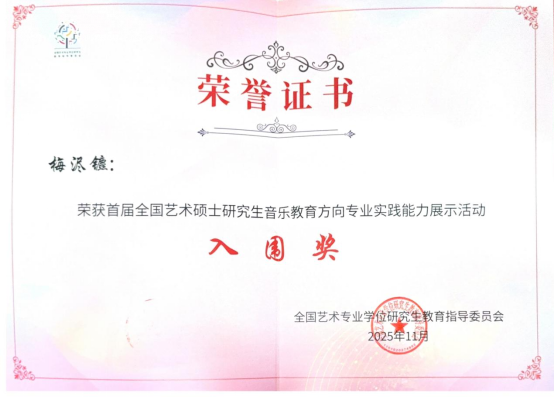 近日,由全国艺术专业学位研究生教育指导委员会主办的首届全国艺术硕士研究生音乐教育方向专业实践能力展示活动在东北师范大学落下帷幕。本次活动作为艺术硕士音乐教育领域的高规格全国性展示平台,共吸引全国49所高校的96名优秀选手参与角逐。活动评选机制严谨,仅设“优秀奖”与“入围奖”两个等级,音乐学院2023级研究生梅浕镳、2024级研究生曹焯焯凭借过硬的专业素养和核心竞争力荣获“入围奖”,指导教师周楼胜教授、刘华清教授获评“入围奖指导教师”,学校获评“优秀组织单位”。
