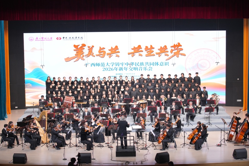 为深入落实教育强国和文化强国战略,12月30日晚,广西师范大学“美美与共·共生共荣”铸牢中华民族共同体意识2026年新年交响音乐会在雁山校区大学生创新创业中心演艺厅举行。活动以铸牢中华民族共同体意识为主线,旨在通过交响乐这一世界性艺术语言,生动展现中华民族多元一体的文化格局,传递“各民族像石榴籽一样紧紧抱在一起”的时代强音。