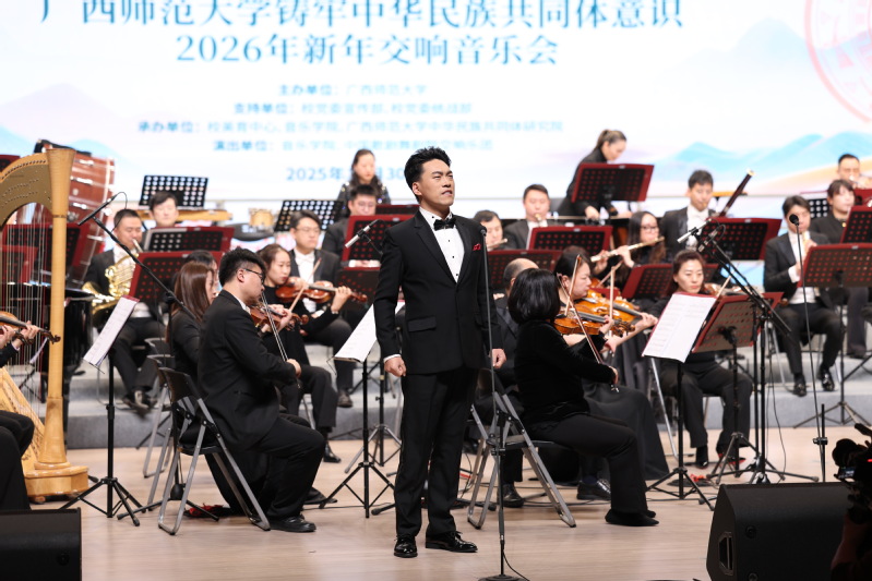 习近平总书记在广西考察时强调,广西要把铸牢中华民族共同体意识作为自治区各项工作的主线,作为推进民族团结进步创建工作的根本方向,巩固发展各族人民团结奋斗的良好局面。作为“教育强桂”“人文兴桂”战略的重要阵地,广西师范大学始终紧扣“铸牢中华民族共同体意识”这条主线,奋力书写新时代育人答卷。本场新年交响音乐会的举办,不仅为岁末年初的校园增添了浓厚的艺术氛围与祥和气息,也是学校将铸牢中华民族共同体意识教育融入办学育人全过程、以文化浸润人心、以艺术凝聚共识的生动实践。