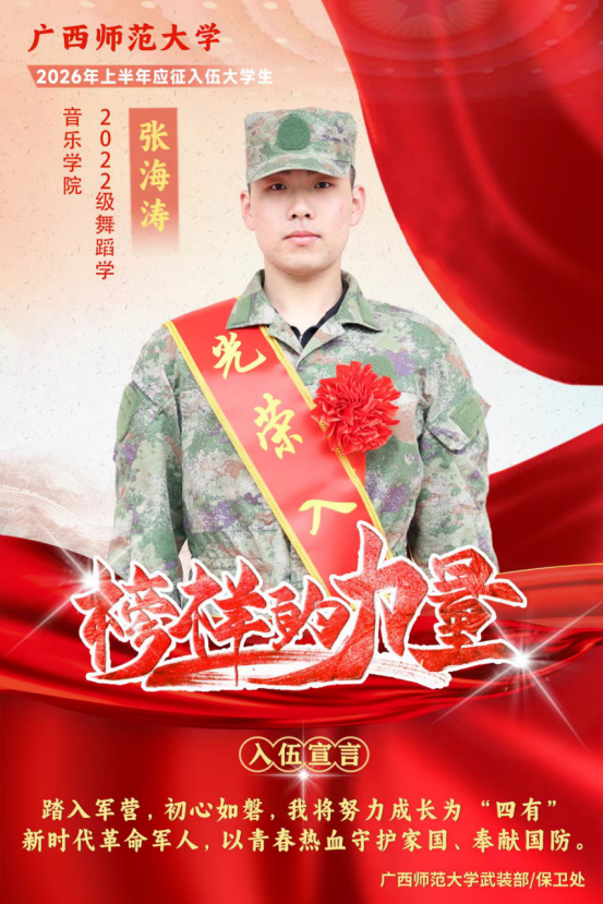 3月12日,广西师范大学2026年春季大学生入伍欢送仪式在雁山校区举行。音乐学院2022级舞蹈学专业学生张海涛经严格选拔,光荣入伍。